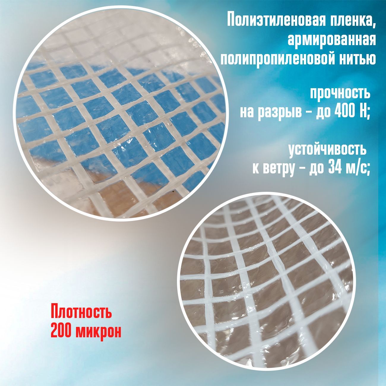 · Армированная пленка с плотностью 200 грамм на 1 квадратный метр. Прочность на растяжение 4 кН/м;