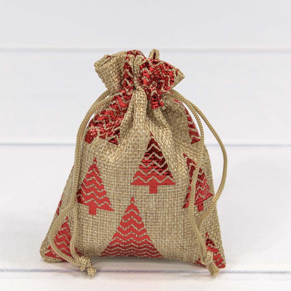 Мешочки из искусственного льна 9*12 с рисунком Ёлки красный