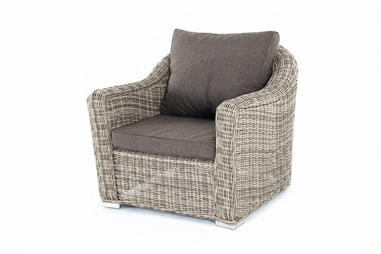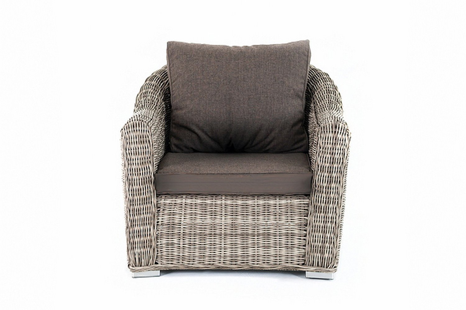 Кресло имеет размеры 90х81х88 см и состоит всего из двух материалов – алюминий и искусственный ротанг. Цвет оплетки (искусственного ротанга) – серый. Форма кресла мягкая – широкие подлокотники плавно переходят в закруглённую форму спинки. Кресло может выдерживать нагрузку до 150 кг, и не является складным.