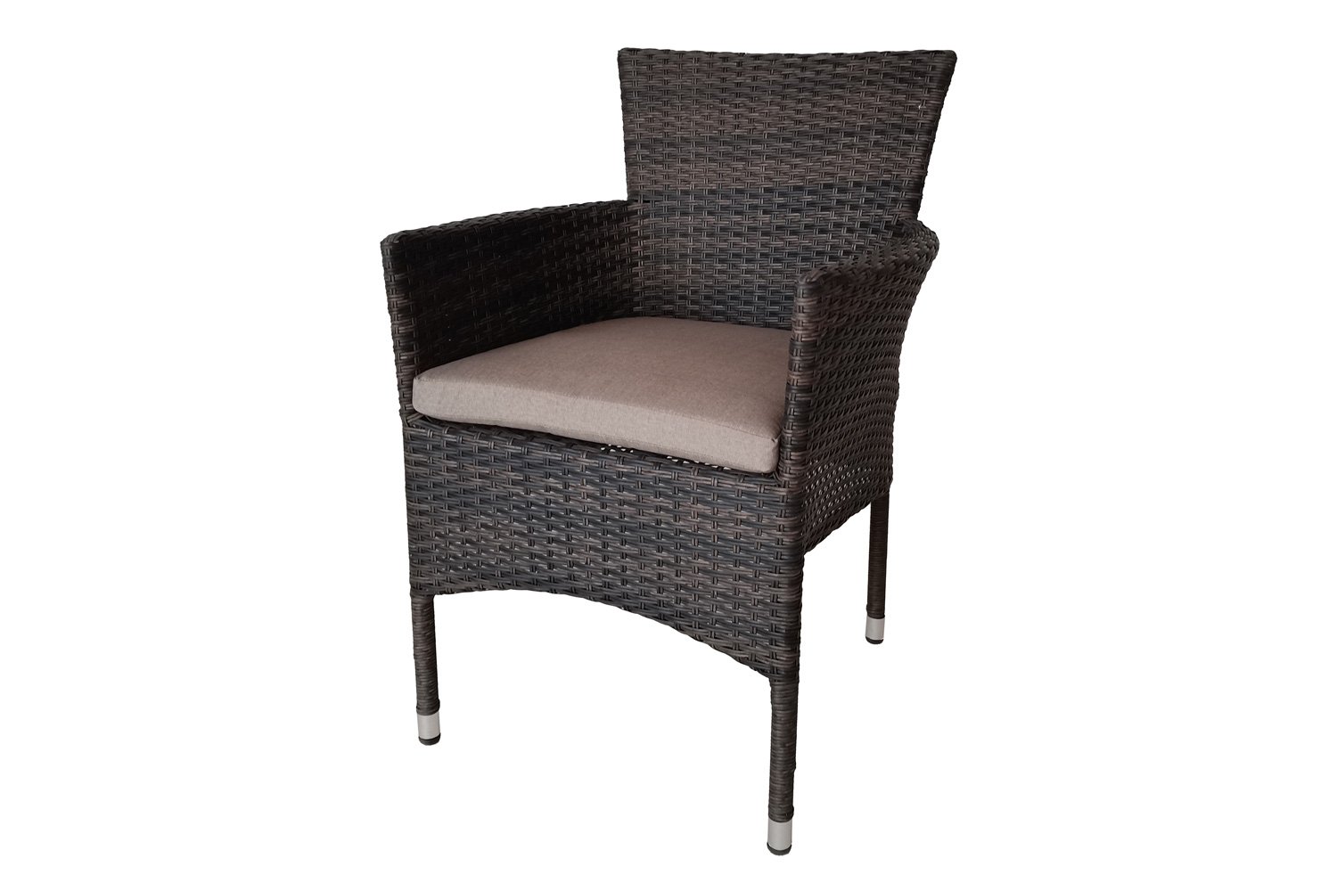 У кресла есть небольшая спинка и узкие подлокотники, которых достаточно для комфортного размещения. Размеры кресла 57х89х61 см, цвет каркаса черный, цвет оплетки коричневый (YJ1768-1). Каркас состоит из стали, оплетка представляет собой переплетение искусственного ротанга. Кресло выдерживает перепад температур в пределах от 0 до +45 градусов, и максимальную нагрузку до 120 кг.