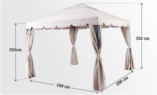 Размеры павильона в смонтированном виде — 299 × 282 × 299 см. Покрытие шатра — полиэстер, ткань имеет УФ-защиту. Набор прост в сборке и эксплуатации, по окончании летнего сезона легко разбирается.