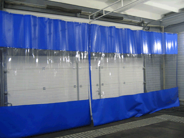 Износостойкие полотна с прозрачной вставкой используют на автомобильных мойках, станциях техобслуживания. Помимо высокой прочности штора выполняет такие функции, как: