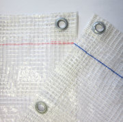 Полог из армированной пленки усиленный брезентом выдерживает максимальные нагрузки, устойчив к механическим повреждениям. В состав современного материала входит: брезентовая лента, мелкоячеистая сетка и прозрачная армированная пленка. По периметру изделия вмонтированы люверсы на равномерном друг от друга расстоянии – 1м.