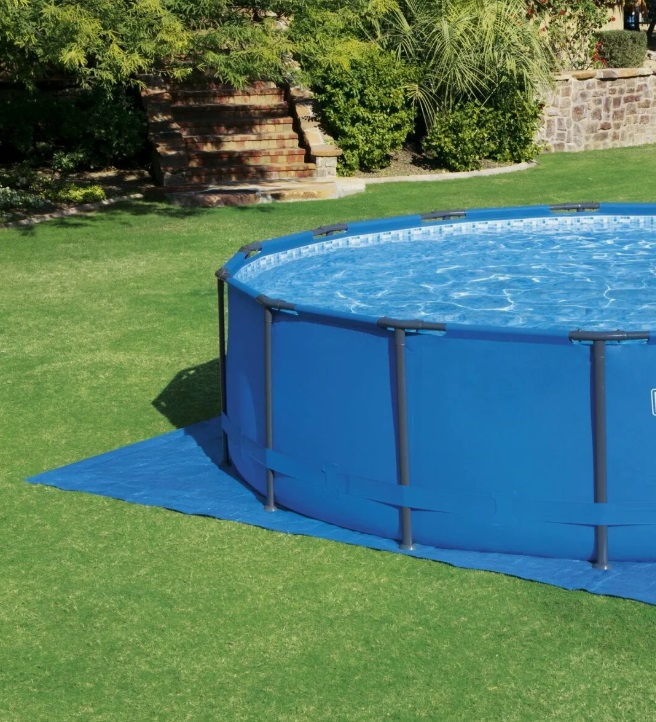 Полотно из ламинированного полипропилена по внешнему виду похоже на мешковину. ПВХ тент крепится к стойкам каркасного бассейна с помощью веревок. Тенты с однослойным материалом прослужат не долго – 2-3 года. А срок двухслойной ПВХ ткани составляет до 5 лет. Тем не менее, покрывало любого качества, упрощает уход за бассейном. В накрытый объем не попадают листья деревьев и другой различный мусор. Над бассейном летают птицы, которые могут пометом загрязнить воду.