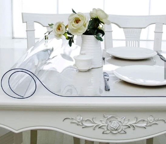 Зачастую прозрачная скатерть производится из поливинилхлорида (ПВХ). Это универсальный материал, использующийся для создания пакетов, окон и прозрачных накладок на столешницы. Готовые прозрачные скатерти из ПВХ имеют несколько особенностей: